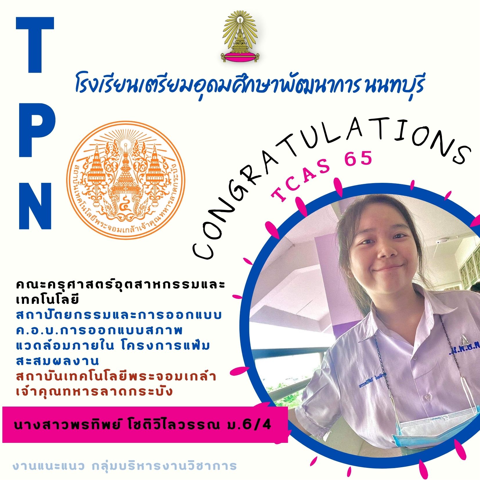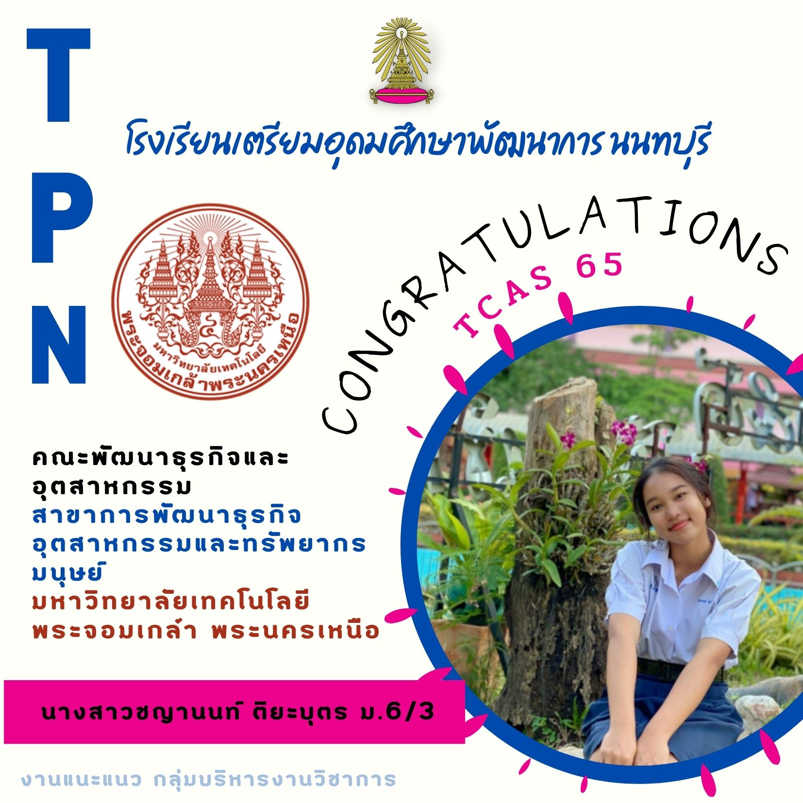 - นางสาวชญานนท์ ติยะบุตร ชั้นมัธยมศึกษาปีที่ 6/3 ได้รับคัดเลือกเข้าศึกษาต่อในคณะ พัฒนาธุรกิจและอุตสาหกรรม มหาวิทยาลัยพระจอมเกล้า พระนครเหนือ