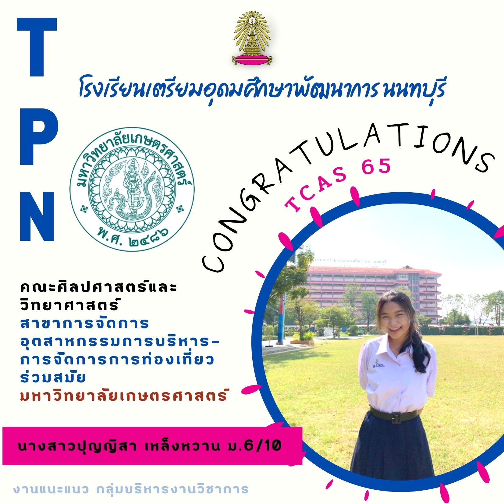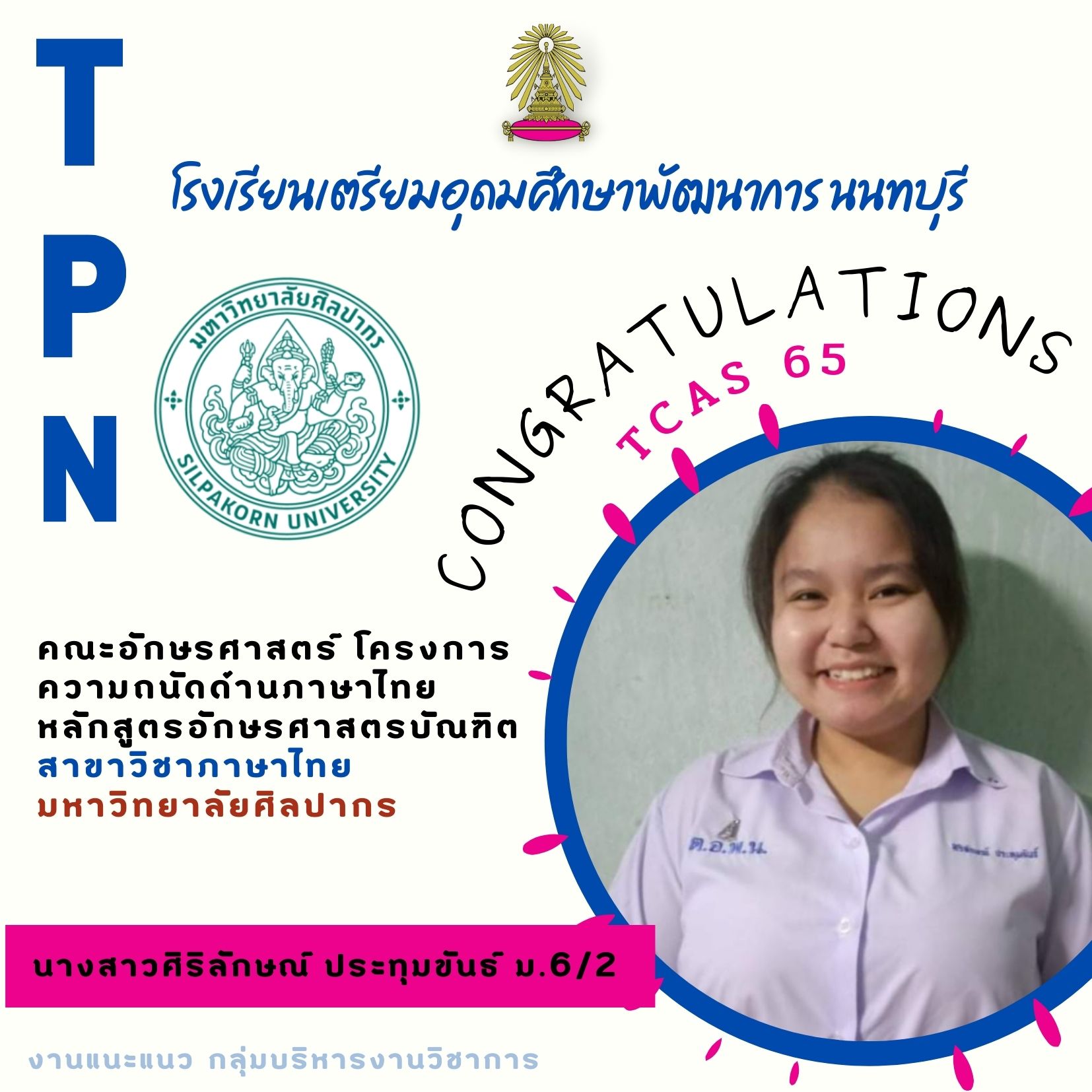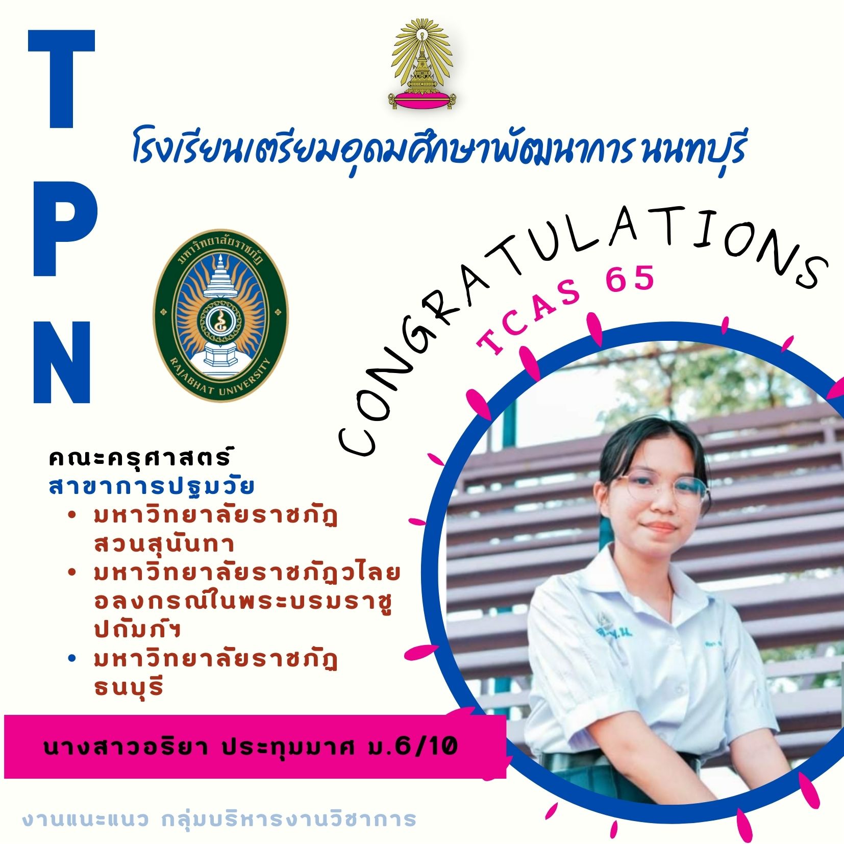 โรงเรียนเตรียมอุดมศึกษาพัฒนาการ นนทบุรี ขอแสดงความยินดีกับลูกพระเกี้ยวน้อย นักเรียนชั้นมัธยมศึกษาชั้นปีที่ 6 ทั้ง 6 คน ที่ได้ผ่านการคัดเลือกบุคคลเข้าศึกษาต่อในระดับมหาวิทยาลัย หรือ TCAS 65 มีรายชื่อดังนี