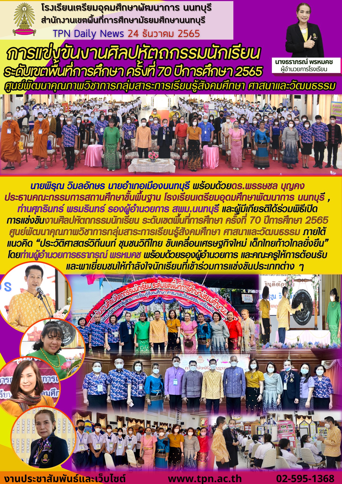 นายพิรุณ วิมลอักษร นายอำเภอเมืองนนทบุรี พร้อมด้วยดร.พรรษชล บุญคง ประธานคณะกรรมการสถานศึกษาขั้นพื้นฐาน โรงเรียนเตรียมอุดมศึกษาพัฒนาการ นนทบุรี ท่านศุภรินทร์ พรมรินทร์ รองผู้อำนวยการ สพม.นนทบุรี และผู้มีเกียรติ ได้ร่วมพิธีเปิดการแข่งขันงานศิลปหัตถกรรมนักเรียน ระดับเขตพื้นที่การศึกษา ครั้งที่ 70 ปีการศึกษา 2565 ศูนย์พัฒนาคุณภาพวิชาการกลุ่มสาระการเรียนรู้สังคมศึกษา ศาสนาและวัฒนธรรม ภายใต้แนวคิด “ประวัติศาสตร์วิถีนนท์ ชุมชนวิถีไทย ขับเคลื่อนเศรษฐกิจใหม่ เด็กไทยก้าวไกลยั่งยืน” โดยท่านผู้อำนวยการธราภรณ์ พรหมคช พร้อมด้วยรองผู้อำนวยการ และคณะครูให้การต้อนรับและพาเยี่ยมชมให้กำลังใจนักเรียนที่เข้าร่วมการแข่งขันประเภทต่าง ๆ