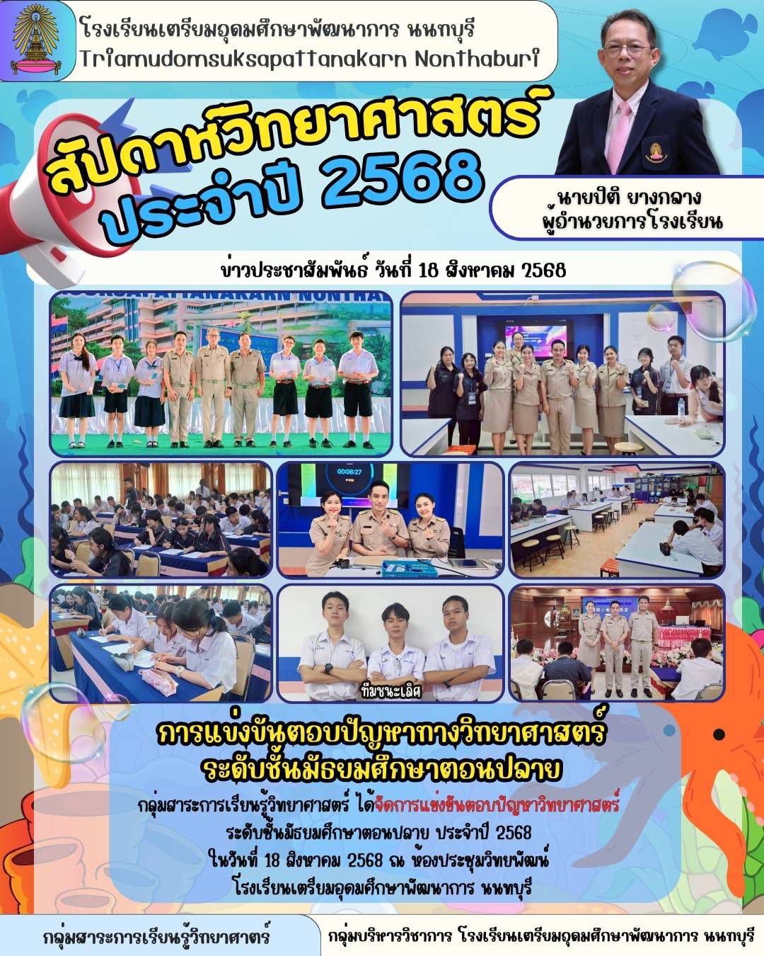การแข่งขันตอบปัญหาทางวิทยาศาสตร์ ระดับชั้นมัธยมศึกษาตอนปลาย กลุ่มสาระการเรียนรู้วิทยาศาสตร์ ได้จัดการแข่งขันตอบปัญหาวิทยาศาสตร์ ระดับชั้นมัธยมศึกษาตอนปลาย ประจําปี 2568 ในวันที่ 18 สิงหาคม 2568 6 ห้องประชุมวิทยพัฒน์ โรงเรียนเตรียมอุดม กษาพัฒนาการ นนทบุรี กลุ่มสาระการเรียนรู้วิทยาศาตร์